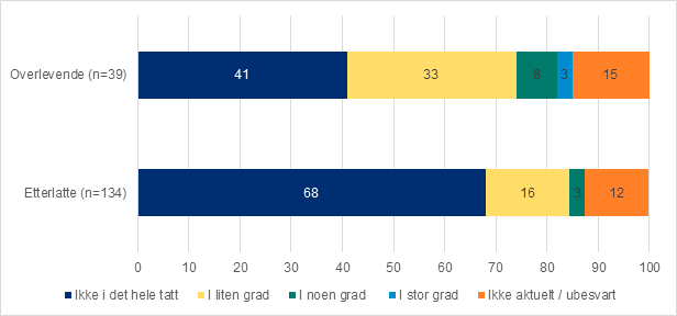 I dag opplever en større andel av de etterlatte enn av de overlevende at helsemyndighetenes oppfølging den gang var utilstrekkelig. Figur 3 viser at 68 prosent av de etterlatte og 41 prosent av de overlevende opplever at helsemyndighetene ikke i det hele tatt sørget for tilstrekkelig oppfølging av dem som ble rammet av ulykken. Spørreundersøkelsen inneholdt også svaralternativet i meget stor grad. Ingen av de overlevende eller etterlatte svarte dette. Det er også en større andel av de etterlatte enn av de overlevende som opplever at myndighetenes håndtering av ulykken har hatt en negativ innvirkning på egen livskvalitet.